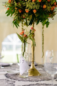 Coordinating the vision of the event was Blush by Brandee Gaar's very own Brandee Gaar, with wonderful assists from the Blush/ Howey Mansion team. Pulling from the mansions history and Mr. Howey's citrus empire, the team really wanted to tie that into the event theme. L&L owner Stephanie was very excited about the inspiration photos, and decided to do a mix of tall and short arrangements featuring orange blooms and citrus fruits for the tented dinner reception. The variation in arrangement height created dimension within the tent, and the beautiful unique linens added visual interest to the space. The cocktail tables throughout the ballroom and on the courtyard terrace were decorated with smaller matching arrangements, to tie into the theme.